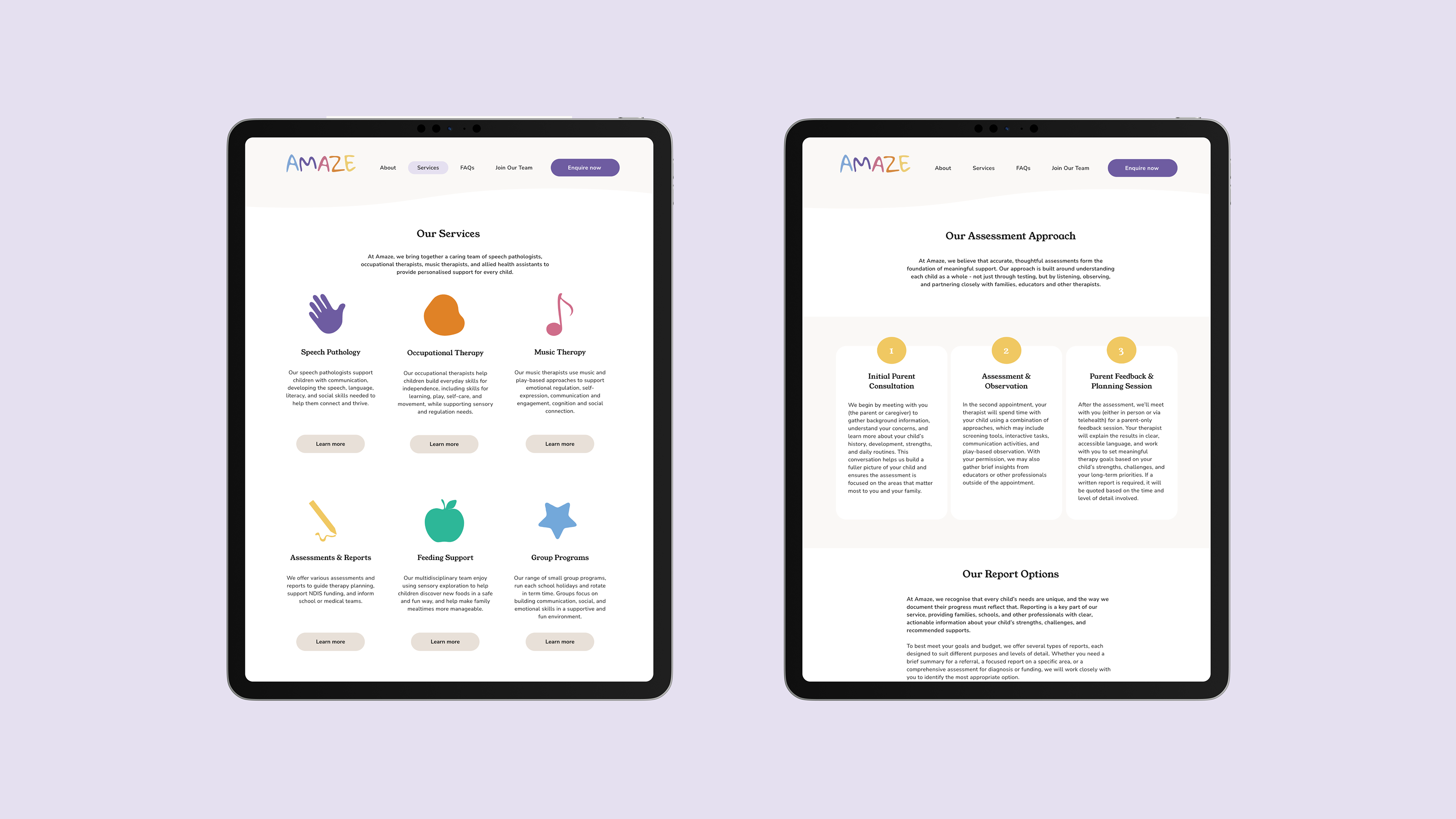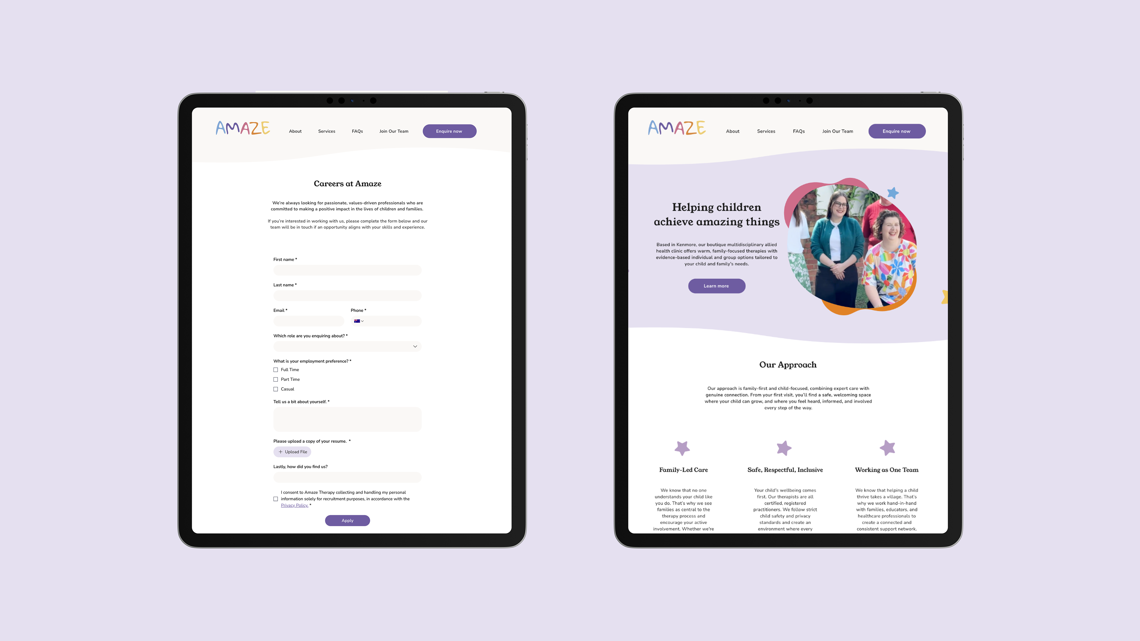 A full redesign of the Amaze Children’s Therapy website was delivered, with a responsive build tailored to meet the needs of two core audiences: families seeking support, and allied health professionals exploring career opportunities. The new site architecture was strategically restructured for intuitive navigation and clear user flows, with additional lead generation forms introduced to streamline enquiries for new clients, career applicants, and room hire.